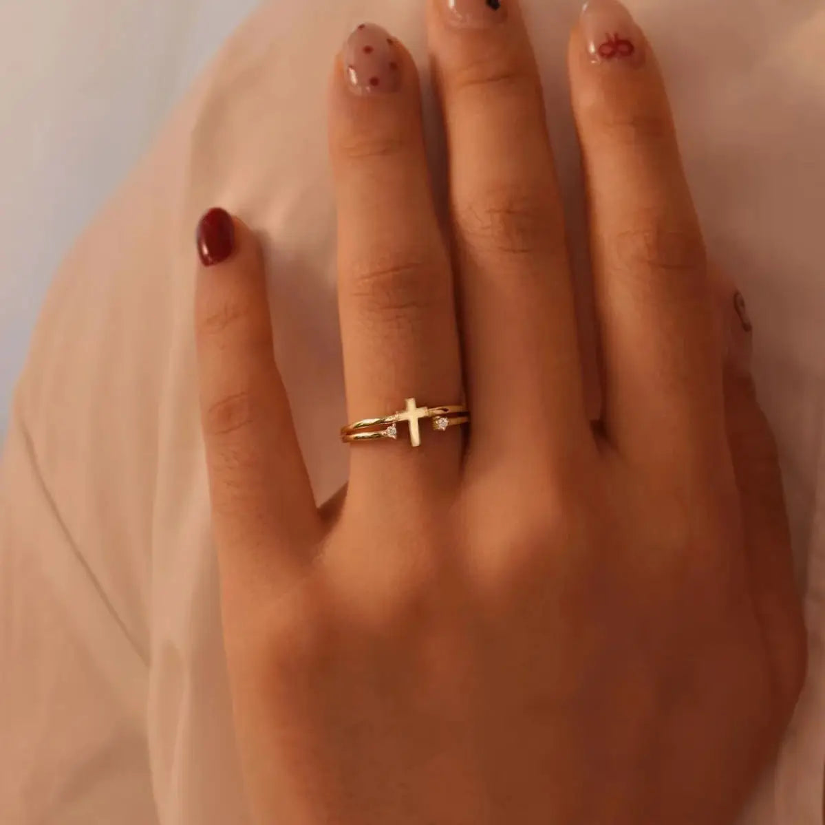 La bague chretienne célèbre la force d'un bijou talisman où la croix devient ligne de lumière au creux de la main. Inspirée du geste d'un pendentif et de l'aura d'un collier iconique, elle capte les reflets d'or et d'argent, parfois éveillés d'un scintillement évoquant des diamants. Elle est la quintessence d'un luxe feutré et d'une élégance sereine.